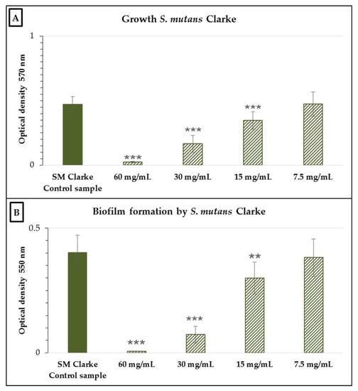 Growth (A) and biofilm formation (B) of Streptococcus mutans Clarke in the presence of various concentrations of the neutralized cell-free supernatant of Streptococcus salivarius K12. SM Clarke control sample: S. mutans Clarke in BHI without the nCFS of S. salivarius K12. Data are expressed as the arithmetic mean ± standard deviation; *** p < 0.001 and ** p < 0.01 compared to the control.