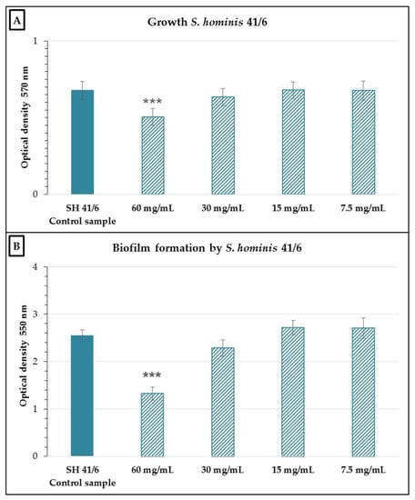 Analysis of growth and biofilm formation in S. hominis 41/6 in the presence of various concentrations of the nCFS showed a significant effect compared to the control (p < 0.001) only at a concentration of 60 mg/mL (Figure 2). In terms of percentage, this represented a 23.16% ± 4.37% growth inhibition and a 42.59% ± 5.07% inhibition of biofilm formation at this concentration.