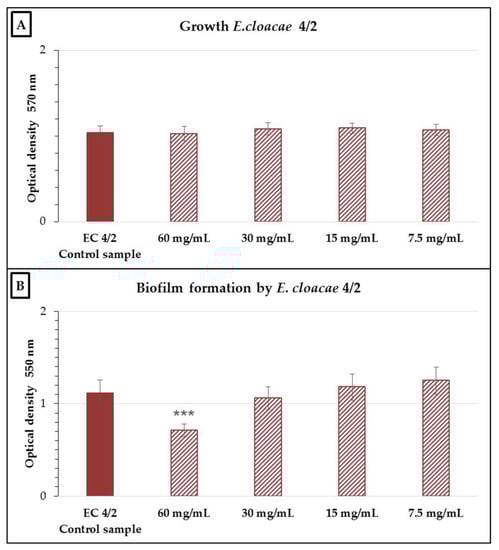 None of the nCFS concentrations tested significantly inhibited the growth of the E. cloacae 4/2 strain (Figure 3). In the evaluation of antibiofilm activity, there was a significant reduction (p < 0.001) in biofilm formation compared to the control at a concentration of 60 mg/mL, which represented a 32.37% ± 3.7% inhibition of biofilm formation.