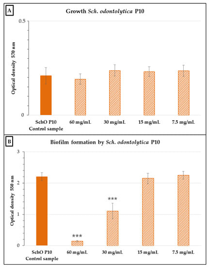 Similar to E. cloacae 4/2, the nCFS had no significant inhibitory effect on the growth of the Sch. odontolytica P10 strain (Figure 4). Testing of the inhibitory activity of the nCFS against Sch. odontolytica P10 showed a significant effect (p < 0.001) on the reduction in biofilm formation at concentrations of 60 and 30 mg/mL compared to the control. The biofilm inhibition was 91.03% ± 1.09% and 48.56% ± 4.48% at concentrations of 60 and 30 mg/mL, respectively.