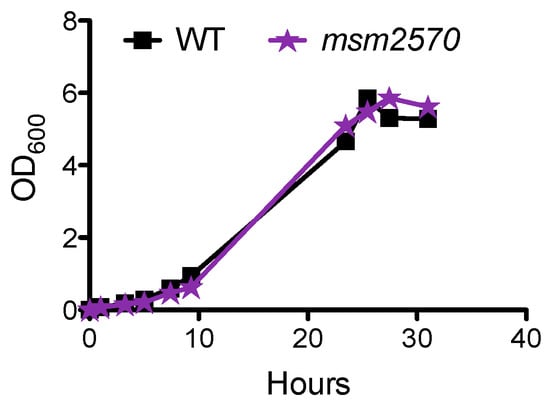 The first approach was to determine the growth rate of the msm2570::Tn transposon mutant measuring culture turbidity (OD600nm) at the indicated time points, Figure 1. Growth of the msm2570::Tn transposon mutant in 7H9 liquid medium was indistinguishable from wild-type bacteria, Figure 1. Therefore, transposon insertion did not alter the proliferation rate of the cells.