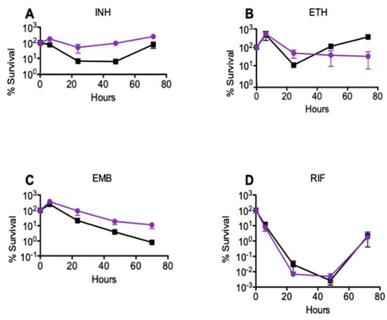 To determine the impact of msm2570 disruption on drug-mediated killing, we measured the killing rate of the msm2570::Tn mutant against the first-line and second-line antituberculosis drugs including isoniazid (INH), ethionamide (ETH), ethambutol (EMB), and rifampicin (RIF). M. smegmatis wild-type and msm2570::Tn transposon mutant strains were exposed to (a) INH 50 µg mL−1, (b) ETH 200 µg mL−1, (c) EMB 5 µg mL−1, or (d) RIF 200 µg mL−1, Figure 2. Serial dilutions of the treated cultures were plated at the indicated time points to determine the percent survival (CFU, colony formation units assay). Results are means ± standard errors from three independent cultures. Figure 2 illustrates that the msm2570::Tn transposon mutant cells had a higher tolerance to INH and EMB compared to wild-type cells.