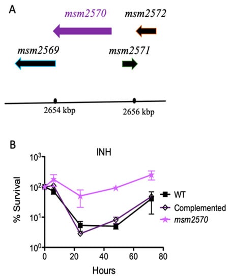 Complementation of the msm2570::Tn mutant. (A) Chromosomal locus encoding the msm2570 gene in M. smegmatis. (B) INH killing assay for the complemented msm2570::Tn mutant in batch culture. M. smegmatis wild-type (■), the msm2570::Tn mutant (⋆), complemented strain (