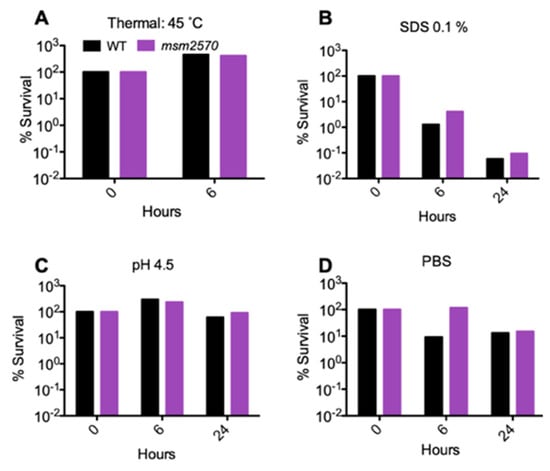 The sensitivity of the msm2570::Tn mutant to other stresses was assessed. First, thermal stress was tested at 45 °C for 6 h. Next, cells were exposed to 0.1% sodium dodecyl sulfate (SDS) detergent for 24 h. Then, nutrient starvation of the msm2570::Tn mutant was determined by incubation of cells in phosphate-buffered saline (PBS) for 24 h. Afterward, the msm2570::Tn mutant was cultured in medium with acidic conditions, pH 4.5, for 24 h. The 0, 6, and 24 h survival of the msm2570::Tn mutant was assessed by withdrawing aliquots of the cultures, plating 10-fold serial dilutions on JALB (Luria-Bertani) agar, and scoring colonies after 3–4 days at 37 °C.