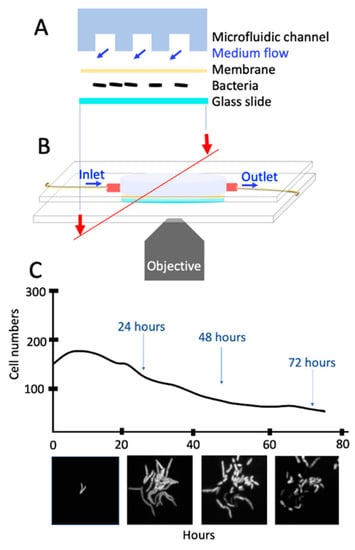 In the past decade, microfluidic and microscopy methods have arisen to overcome the limitations of traditional tools [11,12,13,14,15,16,17,18,19,20,21,22]. The advantages of microfluidic assays over macro-scale, traditional, batch culture methods include increased limit of detection, higher sampling rate, higher specificity, and compatibility with several imaging techniques [11,12,13,14,15,16,17,18,19,20,21,22]. Among these pioneering studies, Kim and co-workers presented that persister cells wake based on ribosome content [8]. Goormaghtigh and Van Melderen observed Escherichia coli (E. coli) cells that generated ofloxacin persisters at the single-cell level using a commercially available CellASIC ONIX B04A-03 Microfluidic Plate (Millipore, USA) and the CellASIC ONIX Microfluidic System [15]. They showed that persister cells did not constitute a slowly growing subpopulation as previously reported [10,14,15,16]. In their experimental model, persisters originated from metabolically active cells, which formed long, polynucleoid filaments and exhibited maximum SOS induction upon removal of ofloxacin. This study demonstrated that the persister subpopulation was heterogeneous. To investigate persistence, a case-by-case analysis was required at the single-cell level. In contrast, Pu et al. reported that dormancy was a passive defense mechanism of E. coli persisters that could be activated prior to enhanced efflux activity. They used single-cell, time-lapse microscopy to measure the fluorescence intensities of the cells in the microchannels [16]. Widels et al. first filtered persister cells, which exhibited β-lactam-induced filamentation, and then monitored awakening of E. coli cephalexin persisters using a microfluidic mother machine device [17]. Similarly, Manuse et al. sorted E. coli cells with low levels of energy-generating enzymes and then observed ATP levels using time-lapse images of the isolated cells in the mother machine device. They showed that cells with a low level of ATP survived in the presence of ampicillin [18].
