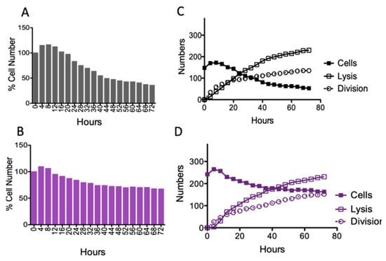 Live-cell imaging was performed using an inverted, automated, time-lapse fluorescent microscope (Olympus IX75) equipped with a Hamamatsu ORCA-AG CCD camera. Using a 100× oil immersion objective (UPLFLN), images were acquired on phase and fluorescent channels (TRIS-red, GFP-green, exposure: 150 µs). Then, images were converted into time-lapse fluorescence movies for image analysis. We used the ImageJ cell counter plugin to count the number of divided and lysed cells for every 4-h time frame. Visualization of the data was performed in GraphPad Prism 4 software.