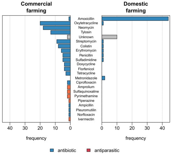 Even though a lower number of antimicrobials was used in domestic poultry compared with commercial poultry farming, domestic farmers showed a higher risk for inappropriate antimicrobial usage. This study observed that about half (45%) of domestic farmers who used antimicrobials administered them daily, which is an alarming finding. The daily routine usage of antimicrobials in domestic poultry increases the risk of antimicrobial-resistant bacteria [23,24,25]. In addition, this practice puts people at risk of ingesting antimicrobial residues through food and drinking water. These findings are supported by Alhaji et al. [13] who also reported improper antimicrobial use in local bird flocks. This study noted that 52% of domestic farmers who administered antimicrobials used those that were recommended by friends and easily acquired them from the nearest pharmacy stores. The easy access to antimicrobials may be a reason for not seeking the professional services of a veterinarian and another reason why domestic poultry owners lack adequate information on the correct usage and dosage of antimicrobials [13].
