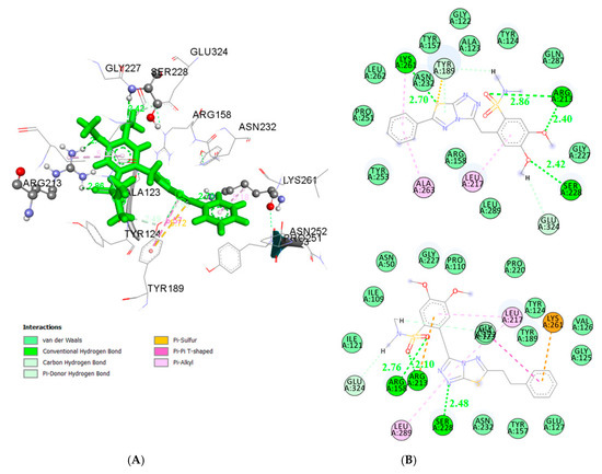 According to docking pose of the most active compound 19 in the E. coli MurB enzyme, four favorable hydrogen bond interactions were observed. They are between the oxygen atom of –one OCH3 group of the compound and the hydrogen of the side chain of Ser228, and the oxygen atom of the other -OCH3 group and the side chain of Arg213 (distance 2.24 Å and 2.40 Å, respectively), as well as between the oxygen atom of the –SO2 group of the compound and Arg231 and the S atom of the compound and Lys261 (distance 2.89 Å and 2.70 Å, respectively). Hydrophobic interaction of the fused rings and the residues Ala123, Tyr189, Asn232, Tyr157, and Arg158 as well as of the substituted benzene and the residues Tyr124, Gln287, Gly227, Glu324, Leu289, and Leu217 were observed (Figure 1). On the other hand, the second benzene ring is placed into a cavity consisting of the residues Leu262, Pro251, Tyr253, and Ala263 displaying hydrophobic interaction which contributed to the stabilization of the compound-enzyme complex, justifying the high activity of derivative 19. It is important to highlight the role of hydrogen bond with the residue Ser228, which is involved in the proton transfer at the second stage of peptidoglycan synthesis [69]. The formation of the above-mentioned hydrogen bond by compound 3 also explains its high inhibitory action (Figure 1). It should be mentioned that these compounds, according to the docking studies, inhibit MurB enzyme almost in a similar way forming a hydrogen bond with the residue Ser228 as 3,5-dioxopyrazolidines reported by Yang et al. [70], as well as the thiazolidinones derivatives of our previous work [71].