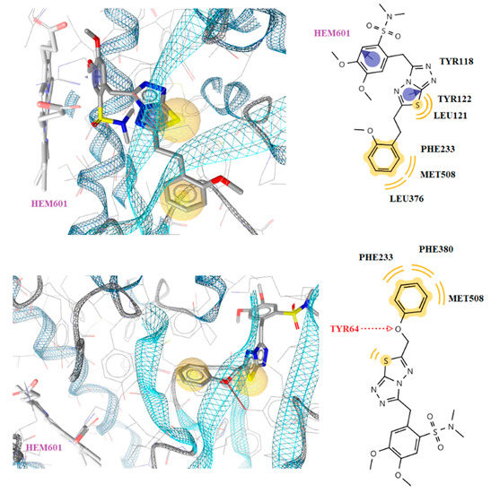 Docked conformation of compound 4 (up) and 6 (down) in lanosterol 14α-demethylase of C. albicans (CYP51ca).