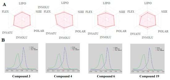 (A) Bioavailability Radar of the tested compounds. The pink area represents the optimal range for each property for oral bioavailability, (Lipophilicity (LIPO): XLOGP3 between −0.7 and +5.0, Molecular weight (SIZE): MW between 150 and 500 g/mol, Polarity (POLAR) TPSA between 20 and 130 Å2, Solubility (INSOLU): log S not higher than 6, Saturation (INSATU): fraction of carbons in the sp3 hybridization not less than 0.25, and Flexibility (FLEX): no more than 9 rotatable bonds. (B) Drug-likeness model score.