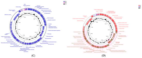 Morphological and genomic characterization of sequenced phages. (A) Image obtained by TEM, vB_Si_35FD, (B) vB_Si_DR094, both phages exhibit icosahedral capsids and long straight tails, which is consistent with the morphology of the Myoviridae family. (C) Visualization of the complete genome of vB_Si_35FD sized 85 kb with 129 identified CDS (blue); most of the genes were transcribed from the forward strand (external CDS) and 19 tRNAs (pink); in black is the G+C content that, on average, was 38.9%. (D) vB_Si_DR094 genome visualization, sized 85.7 kb with 125 identified CDS (red); in purple are marked 20 tRNAs, and the G+C% on average was 39.2% (black).