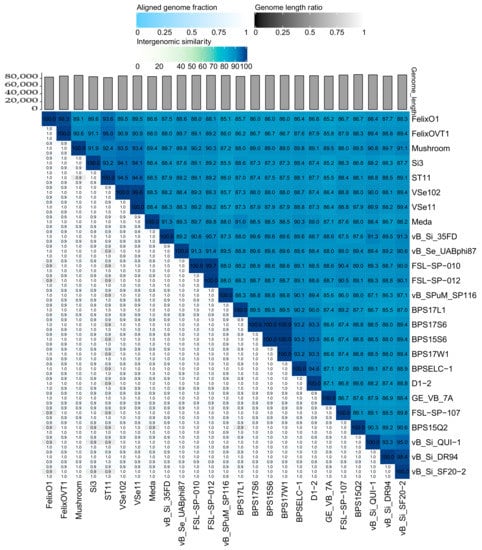 Nucleotide-based intergenomic analysis showed similarities above 85.1%, with an aligned fraction of the genome of 0.9-1.0 and a genome length ratio of 0.9–1.0 (Figure 2). The thresholds used to group phages in taxonomic levels are 70% for genus and 95% for species []. The two new members reported here were 89.5% similar (Figure 2). A total of 10 phages are represented in the same species, of which the phages vB_Si_DR94 and vB_Si_SF20-2 showed 98.4% similarity. This was also noted with phages vB_Si_QUI-1 and vB_Si_SF20-2, which have a similarity of 95.0% and were also recovered in Chile from poultry feces []. On the other hand, phages VSe102 and ST11 had 99.6% similarity and both viruses were isolated in Russia []. Interestingly, the phage ST11 and FelixO1_VT1 showed 95.0% similarity but were isolated from different countries. Specifically, phage ST11 was isolated in Russia from chicken feces, whereas phage FelixO1_VT1 was collected in the US with source unreported []. Likewise, we observed a cluster of three phages with 100% similarity (BPS17S6, BPS15S6, and BPS17W1) (Figure 2). All of these phages were isolated in China from sewage samples in layer houses or slaughterhouses (Table 1). Overall, our findings show that the genus Felixounavirus is composed of highly similar members with a wide geographical distribution.