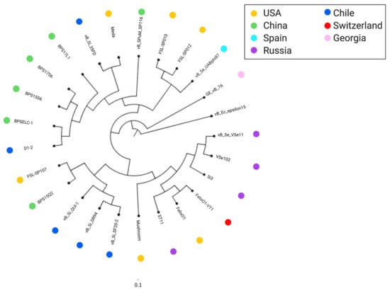 Regarding the geographical origin of these phages, they were isolated from three different continents: the Americas (the US and Chile), Asia (Russia and China), and Europe (Georgia, Spain, and Switzerland), with China reporting 7/23 of the phage genomes from the genus Felixounavirus. This genus is distributed worldwide, with different sources used for isolation, and animal feces as one of the most frequent sources. The fact that animals are carriers of Salmonella with high levels of antimicrobial resistance has encouraged studies of screening for phages, as alternative strategies for controlling this pathogen []. Moreover, Felixounavirus related to Salmonella were found with desirable characteristics and selected for sequencing. The genome sizes of all phages reported is on average 86.6 kb, with phage ST11 (MF370225.1) containing the smallest assembled genome of 82.1 kb and phage BPS15Q2 the largest assembled genome of 89.8 kb (KX405003.1) (Table 1). Re-annotation of the 23 analyzed genomes revealed that the amounts of tRNA ranged from 17 to 23 and coding regions (CDS) ranged from 125 to 165, among which phage GE_vB_7A isolated from Georgia contained 165 CDS, yet still did not represent the largest assembled genome.