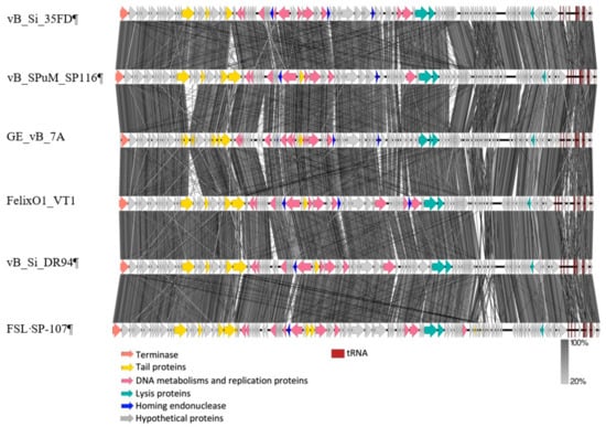 Four genomes were selected from the phylogenetic tree: vB_SPuM_SP116 (KP010413.1), GE_vB_7A (MG969404.1), FSL-SP107 (KC139638.1 and KC139640.1), and FelixO1 (AF320576.1) for the phylogenetic analyses, along with the phages vB_Si_35FD and vB_Si_DR094. These were aligned using EasyFig v2.2.2 []. The average BLAST nucleotide identities were calculated by using VIRIDIC [].