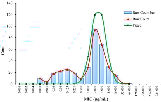 - Turnidge, J.; Kahlmeter, G.; Kronvall, G. Statistical characterisation of bacterial wild-type MIC value distributions and the determination of epidemiological cut-off values. Clin. Microbiol. Infect. 2006, 12, 418–425. [Google Scholar] [CrossRef]