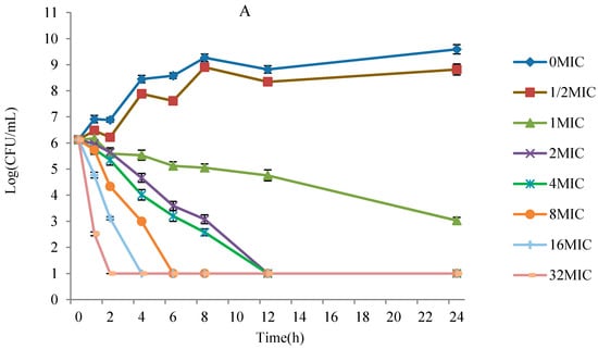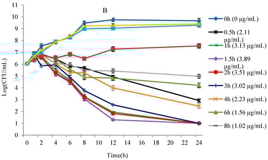 PK-PD parameters were estimated using Winnonlin (v.5.2.1 US Certara Pharsight®) with a two-compartment model. According to the ex vivo time-killing curve, the Sigmoid Emax model () was used to calculate the AUC24/MIC (AUIC) of danofloxacin at different concentrations, E is the summary PD endpoint, and E0 is the effect representing the value of the PD endpoint without drug treatment (i.e., the value of the summary endpoint when the PK-PD index is 0). X is one of the three PK-PD indices as defined above, and PDmax is the maximum effect (in relation to E0) indicated by the plateau where increased exposures result in no further kill. EC50 is the magnitude of X that is needed to achieve 50% of PDmax, and γ is the sigmoidicity factor. The PD target under different efficiency (E = 0, −3 and −4 (bacteriostasis, bactericidal and eradication)) was determined with Sigmoid Emax equation [28,29]. The dosage regimen was derived from the concentration-dependent dosage equation () [30,31,32]. In the equation, the CL (mL/h) was the plasma (total) clearance per day, AUIC (h) was the targeted endpoint for optimal efficacy, fu was the free fraction of the drug in PELF (from 0 to 1), and F was the bioavailability factor (from 0 to 1). In this study, fu was 0.8974, which was obtained by measuring the protein binding rate by the equilibrium dialysis method.