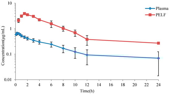 The concentration-time curves in plasma and PELF after administration of danofloxacin at a single dose of 2.5 mg/kg b.w. are shown in Figure 3. Concentrations of danfloxacin in plasma and PELF at various time points are shown in Table S2. A striking difference is observed between drug concentrations in plasma and in PELF.
