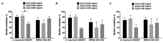 Biofilm inhibition activity. Effect of different concentrations (A: 0.625 mg/mL, B: 0.3125 mg/mL, and C: 0.156 mg/mL) of Caralluma quadrangula extracts (Cq1, Cq2, and Cq3) against MDRAB AB5057 and MRSA USA300 biofilm formation. Results are expressed as mean biofilm inhibition % ± standard error. * Indicates that the difference is significant at p < 0.05 (two-way ANOVA, Tukey’s post-hoc test).