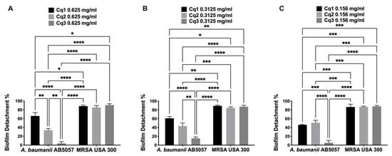 Biofilm detachment activity. Effect of different concentrations (A: 0.625 mg/mL, B: 0.3125 mg/mL, and C: 0.156 mg/mL) of Caralluma quadrangula extracts (Cq1, Cq2, and Cq3) on previously established MDRAB AB5057 and MRSA USA300 biofilm. Results are expressed as mean biofilm detachment % ± standard error. *, **, ***, and **** indicate that the difference is significant at p < 0.05, p < 0.005, p < 0.0005, and p < 0.0001, respectively (two-way ANOVA, Tukey’s post-hoc test).