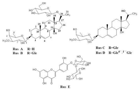 Based on the results of the biofilm inhibition assay and the in vivo skin infection murine model, the n-butanol fraction was selected for further chromatographic separation for its bioactive components. Four major pregnane glycosides (Rus A–D) and one flavonoid (Rus E) were separated (Figure 4). The identification of the isolated compounds was achieved using 1H- and 13C-NMR and by comparison with authentic samples previously isolated from C. russeliana [28].