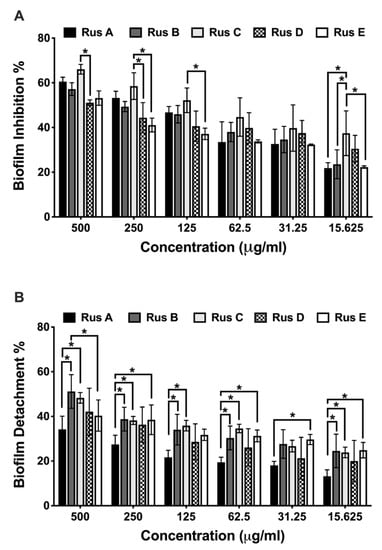 Antibiofilm inhibition activity. Effect of different concentrations (500–15.625 μg/mL) of the isolated Caralluma quadrangular compounds (Rus A–E) on MRSA USA300 biofilm. Results are expressed as mean biofilm inhibition % ± standard error (A) and mean biofilm detachment % ± standard error (B). * Indicates that the difference is significant at p < 0.05 (two-way ANOVA, Tukey’s post-hoc test).