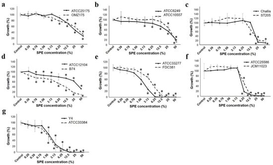 SPE inhibits bacterial growth. Test two strains of each bacteria growth measured at OD600 are indicated. The figure of each alphabet shows the following two strains of bacteria; (a): S. mutans, (b): S. oralis, (c): S. gordonii, (d): A. naeslundii, (e): P. gingivalis, (f): F. nucleatum, and (g): A. actinomycetemcomitans. The strain number is shown in the upper right of each figure. Result is shown as a ratio to that with 100% control. Each sample (n = 6) indicated the statistical significance of difference between control and treated samples, determined using one-way ANOVA with Scheffe’s test (* p < 0.05).