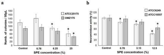 S. oralis ATCC6249 and ATCC10557 neuraminidase activity was suppressed in a concentration-dependent manner and a significant decrease was observed from low concentration, especially in ATCC6249 (Figure 3b). This enzyme is involved in the decomposition of tissue components and the exposure of various bacterial adhesive sites [36]. In this regard, it was confirmed that SPE inhibits enzyme production in addition to suppressing growth.