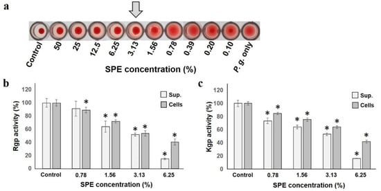 P. gingivalis hemagglutination capacity, which is deeply involved in adhesion and colonization to the host, was inhibited by SPE (Figure 4a). Hemagglutination inhibition started at 6.25%, and was completely inhibited at 3.13%, indicating that SPE suppressed P. gingivalis hemagglutination ability. The most famous P. gingivalis protease is gingipain, known as Arginine-gingipain (Rgp) and Lysine-gingipain (Kgp) [37]. Both Rgp and Kgp activities produced by P. gingivalis were suppressed, depending on the SPE concentration to which both the supernatant and cells were added (Figure 4b,c). In particular, it was confirmed that the addition of a low concentration of 1.56% already significantly suppressed the most important virulence factor of this bacterium.