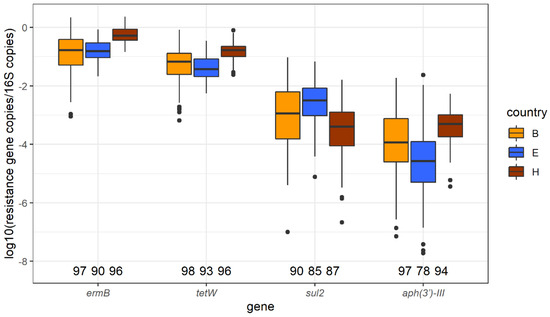 In total, 304 samples were analyzed by qPCR. Across all samples, the number of 16S rRNA gene copies varied (log10 copies median = 10.8, min = 7.73, and max = 12.8). The number of 16S rRNA copies were used subsequently to calculate relative concentrations of the AMR gene copies. After the qPCR quality check, in order to include samples with a low concentration of sul2 (11 samples) and aph3′-III (20 samples) that were below the limit of detection or limit of quantification, the following values were assigned: sul2: 5.10; aph3′-III: 3.62. The unit was the number of gene copies (log10 copies) before normalization with 16S rRNA. Of those, two aph3′-III samples were removed due to a low abundance of 16S rRNA (log10 16S rRNA copies < 8.51). As a result, 283 (93.1%), 287 (94.4%), 262 (86.1%), and 269 (88.5%) samples for ermB, tetW, sul2, and aph3′-III, respectively, were available for analysis. The abundance of the four genes relative to bacterial DNA (16S rRNA), stratified per country and gene is shown in Figure 3.