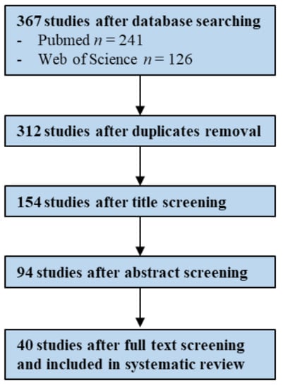 The systematic on PubMed and Web of Science databases generated a total of 367 studies of which 40 were identified as eligible after duplicates removal, title, abstract and full-text screening based on inclusion and exclusion criteria (Figure 1).