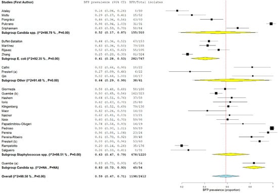 The estimate for the “Candida spp. subgroup” was not much lower (proportion 0.57; 95% CI: 0.28–0.86; p < 0.01). The lowest estimate proportion was found for the “E. coli subgroup” (proportion 0.41; 95% CI: 0.28–0.53; p < 0.01). Despite the BFP proportion being considerable for all subgroups, estimates and 95% CIs varied deeply, which resulted in very high heterogeneities (all subgroups with I2 > 90% and p < 0.01) and made the meta-analysis unreliable and consequently inconclusive. Since a single-arm analysis does not include a comparison or control group, specific criteria were included for the BFP method to attempt to diminish heterogeneity (see Section 2.2). There are many other variables that influence outcomes within the BFP method. Still, they were not considered criteria to obtain a considerable or minimum number of studies. These include culture media, concentrations and time procedures, optical density (OD) values and cut-offs, etc. The main purposes of the included papers were not to exclusively assess biofilm prevalence but also to link it with other factors or outcomes. Added to the fact that a single-arm analysis (lacking a comparison group) is not so valuable as two-arm, another problem is also noted, the use of in vitro methods as the only tool. In fact, they are the most used techniques to detect BFP capacity, but do not accurately represent in vivo conditions and are not always demonstrative of the biofilms found in infections [].