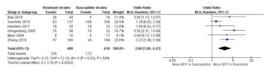 Higher BFP prevalence in resistant strains was observed with high statistical significance (odds ratio-OR: 2.68; 95% CI: 1.60–4.47; p < 0.01) (Figure 3). A reasonable overlap is noticeable of CIs and OR estimates between all studies. This translated into a moderate statistical heterogeneity (I2 = 59%; p = 0.03), which is still remarkable since there is a sizeable heterogeneity in the study design (retrospective, retrospective cohort, prospective, resistance detection method, etc.) and clinical criteria (i.e., demographics, comorbidities, treatment interventions, outcomes, etc.) between studies. The observed results suggest that these factors do not seem to severely affect the influence of biofilm on antimicrobial resistance. Additionally, there was not a single study with an OR < 1, which would indicate higher BFP in susceptible strains. Thus, there is considerable evidence that biofilm may play an important role in the resistance to antibiotics by the identified strains. Yet, since five out of six studies reports were about methicillin-resistant Staphylococcus spp., this was mainly applicable to that group of bacteria.