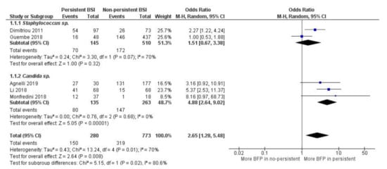 Subgroup analysis indicates that there is significantly more BFP production in persistent candidemia (OR: 4.88; 95% CI: 2.64–9.02; p < 0.01) than in persistent bacteremia from Staphylococcus spp. (OR: 1.51; 95% CI: 0.67–3.38; p = 0.32). Within both subgroups, there was no heterogeneity. However, it was high between subgroups (I2 = 80.6%; p = 0.02), supporting the idea that Candida spp. biofilms can have a greater impact on infection persistence. Nevertheless, there is a substantial lack of studies, especially for subgroups analysis. Publication bias was not assessed.
