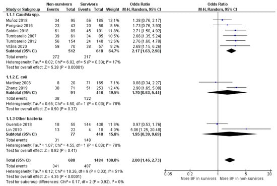 In “E. coli” (OR: 1.70; 95% CI: 0.53–5.44; p = 0.37) and “Other bacteria” subgroups (OR: 1.95; 95% CI: 0.39–9.69; p = 0.41), OR values leaned towards higher BFP in the non-survivors’ group, but statistical significance was not achieved. Statistical heterogeneity was high for both subgroups (I2 = 78%; p = 0.03) and they had one study each where OR values were close to 1, which made both estimates too uncertain (large CIs). Hence, these subgroups’ analyses are quite inconclusive due to insufficient papers and data. The most clarifying estimative was from the first subgroup (Candida spp.). High statistical significance indicates that BFP impacts candidemia mortality (OR: 2.05; 95% CI: 1.53–2.74), and there was no OR value below 1. Notably, only in Muñoz et al. [] and Pongrácz et al. [], the level of BFP did not correlate with statistical significance to candidemia mortality.