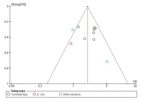 In the work of Zhang et al. [] it was performed a retrospective study to infer the role of biofilm formation by E. coli extended-spectrum β-lactamases (ESBL) producers for cancer patients to develop BSI. They showed that ESBL E. coli (particularly bla CTX-M-15 type) are highly prevalent among cancer patients with BSI. In addition, the presence of biofilms contributes to the appearance of ESBL E. coli multi-drug resistance, increasing the risk of mortality in these patients. In fact, data obtained from the meta-analysis showed potentially worrying findings on the BFP impact, as it had a high OR and a comparatively narrow CI (OR: 3.23; 95% CI: 1.88–5.54). It is well known that the production of ESBLs is an important resistance mechanism that hampers the treatment of microbial infections []. It has already been observed that mortality rates associated with bacteremia caused by ESBL producing E. coli are significantly higher than those related with non-ESBL producing E. coli []. However, more data would be optimal to provide overall publications bias evaluation as well as to provide more confidence to assumptions.