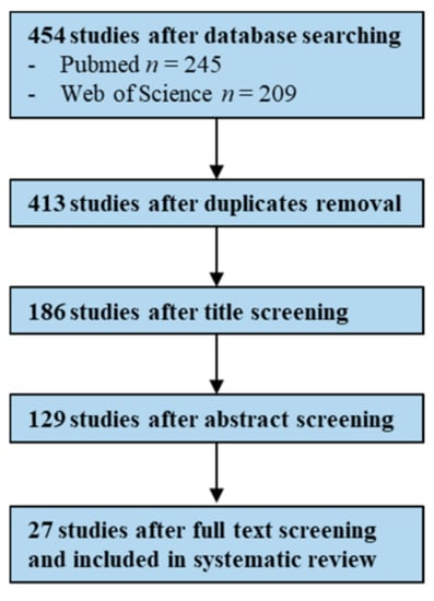 The systematic search on PubMed and Web of Science databases generated a total of 454 studies, of which 27 were identified as eligible after duplicates removal, title, abstract and full-text screening based on inclusion and exclusion criteria (Figure 7).