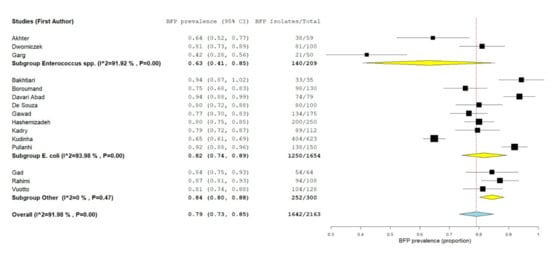 Combined data from 16 studies were pooled in the forest plot presented in Figure 8. “Enterococcus spp.” subgroup had the lowest estimate proportion (proportion 0.63; 95% CI: 0.41–0.85; p < 0.01), followed by “E. coli” subgroup (proportion 0.82; 95% CI: 0.74–0.89; p < 0.01) and by “other” bacterial species subgroup (proportion 0.84; 95% CI: 0.80–0.88; p < 0.01). Overall BFP prevalence estimate was significantly higher (proportion 0.79; 95% CI: 0.73–0.85; p < 0.01) than the estimate observed in BSI analysis (see Section 2.1.3). However, statistical heterogeneity was very high (I2 = 92%; p < 0.01), just as it was in the BSI meta-analysis. This is once more, due to an absence of a fully standardized in vitro BFP method. In addition, the lack of a comparison group along with a simplistic (compared to in vivo) in vitro method, has led once again to inconclusive results. Statistical heterogeneity from the last subgroup (three studies from different bacterial species) was inexistent (I2 = 0%; p = 0.47), yet this seems to be a coincidence.