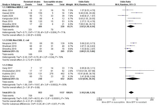 Considering that UTI included more papers (n = 13) than in BSI meta-analysis (n = 6), high BFP prevalence in resistant strains was observed with slightly higher statistical significance (OR: 3.18; 95% CI: 1.88–5.39; p < 0.01) (Figure 9). However, contrary to BSI where overall statistical heterogeneity was low, UTI statistical heterogeneity was from moderate to high (I2 = 74%; p = 0.10). The reason for this divergence can be the higher number of studies, the higher difference in study designs and/or superior sensibility to clinical heterogeneities. The “other” subgroup heterogeneity was high (I2 = 85%; p < 0.01), while “MDR/Non-MDR E. coli” and “ESBL/non-ESBL E. coli” subgroup heterogeneities were both moderate (I2 = 71%; p < 0.01; I2 = 70%; p = 0.04), possibly reflecting the inclusion of the same group of E. coli resistance type.