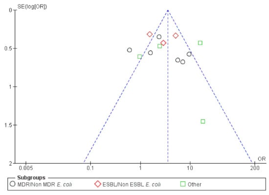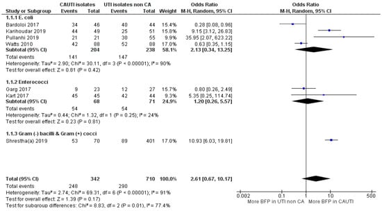 The OR estimate for the “other” subgroup was extremely high (OR: 4.42; 95% CI: 0.96–20.35; p < 0.01). However, this value was leveraged by the outcome in the study of Kudinha et al. [], as the OR value (OR: 15.91; 95% CI: 6.88–36.78) and sample size (n = 623) were enormous. In this work, BFP prevalence was compared in E. coli clonal group, sequence type 131 (ST131) vs. non ST131 E. coli isolates obtained from women of reproductive age (central west region of New South Wales-Australia) with cystitis or pyelonephritis. Even though no more studies reported ST131, BFP was strongly associated with its presence. ST131 is the predominant E. coli clonal group among extraintestinal pathogenic E. coli isolates worldwide, suggesting it contributes to resistance. They are frequently reported to produce ESBLs, and almost all are resistant to fluoroquinolones. Due to both the spectrum of infections that they cause and the large number of virulence-associated genes that they contain, ST131 E. coli isolates are considered to be truly pathogenic []. In this regard, Johnson et al. [] reported that this clonal group is probably the cause of the most E. coli infections with associated resistance to antimicrobials in the US (2007). Garg et al. [] did not recognize BFP as an independent factor for the observed resistance of enterococci to vancomycin isolated from UTIs. Khodadadian et al. [] showed that the presence of K. pneumoniae producers of Metallo-β-lactamases in the samples of UTI (VIM-1 and IMP-1) are associated with BFP, despite a large CI shown in the meta-analysis. Finally, Rahimi et al. [] highlighted the relevance of BFP and virulence factors expression by MRSA strains, in catheterized patients that developed UTI.