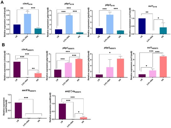We previously observed that the expression levels of carbapenem-resistance genes were affected when LB was supplemented with 3.5% HSA or HS (Le et al., 2021 submitted). Further examination of the effect of these supplements on other genes related to β-lactam resistance, showed that the expression levels of pbp1 and pbp3, coding for penicillin-binding proteins [27,28], were up-regulated in LB supplemented with 3.5% HSA in A. baumannii A118, AB5075 (Figure 1A,B), and ABUH702 (Figure S1). All strains but A118 underwent an increase in levels of expression of pbp1 and pbp3 when cultured in HS (Figure 1, Figure 2 and Figure S1). The blaPER-7 gene, present only in strain AMA16, was also up-regulated in the presence of 3.5% HSA or HS (Figure 2A).