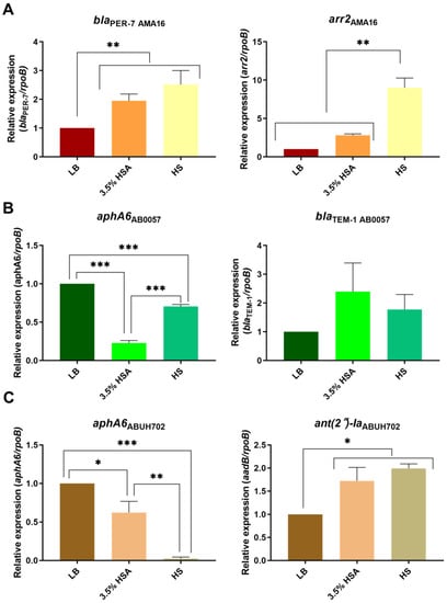 Effect of human serum albumin (HSA) and pooled normal human serum (HS) on the expression of antibiotic resistance genes of A. baumannii strains. qRT-PCR of AMA16: (A) AB0057 (B) and ABUH702 (C) strains genes associated with antibiotic resistance expressed in LB, LB supplemented with 3.5% HSA, or in HS. Fold changes were calculated using double ΔΔCt analysis. At least three independent samples were used. LB was used as the reference condition. Statistical significance (p < 0.05) was determined by ANOVA followed by Tukey’s multiple-comparison test, one asterisks: * p < 0.05; two asterisks: ** p < 0.01; and three asterisks: *** p < 0.001.