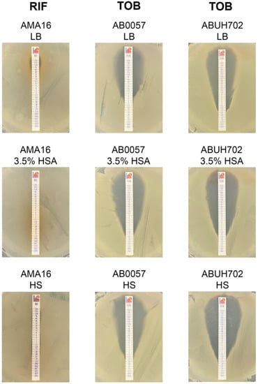 Antibiotic susceptibility assays were performed following the procedures recommended by the Clinical and Laboratory Standards Institute (CLSI) [51]. After OD adjustment, 100 μL of cells grown in fresh LB medium, 3.5% HSA containing LB medium or HS, were inoculated on Mueller-Hinton agar plates as previously described [17,21]. Antimicrobial commercial E-strips (Liofilchem S.r.l., Roseto degli Abruzzi, Italy) for rifampicin (RIF), tobramycin (TOB), amikacin (AK), and gentamicin (CN) were used. Mueller-Hinton agar plates were incubated at 37 °C for 18 h. CLSI breakpoints were used for interpretation.