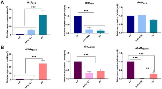 Effect of human serum albumin (HSA) and pooled normal human serum (HS) on the expression of quorum sensing genes in A. baumannii. qRT-PCR of A118 (A) and AB5075 (B) strains of the aidA, abaI, and abaM genes associated with quorum sensing and quorum quenching expressed in LB, LB supplemented with 3.5% HSA, or in HS. Fold changes were calculated using double ΔΔCt analysis. At least three independent samples were used. LB was employed as the reference condition. Statistical significance (p < 0.05) was determined by ANOVA followed by Tukey’s multiple-comparison test, two asterisks: ** p < 0.01 and three asterisks: *** p < 0.001.