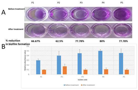 A significant reduction of biofilm formation by five P. gingivalis isolates induced by the frankincense extract: (A) crystal violet assay in microtitration plate; (B) a chart representing the significant decrease in the relative absorbance values of the formed biofilms after treatment.