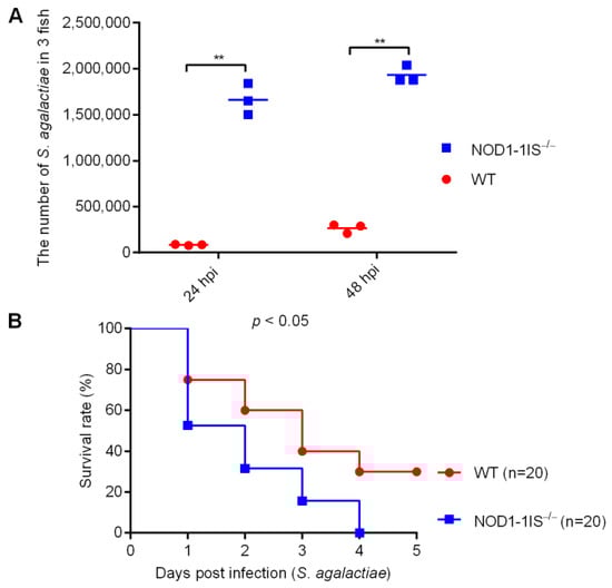 Among NLRs, NLRP3 but not NOD2 plays a crucial role in the control of in vivo S. agalactiae growth and in host resistance against S. agalactiae infection. Zebrafish NOD1 is known to be involved in the host recognition of Salmonella enterica and spring viremia of carp virus [32,33], but its role in the host response to S. agalactiae infection has not been described. Previous studies have developed a zebrafish model of S. agalactiae infection by injection to study bacterial and host factors that contribute to disease progression [34,35]. Bath immersion can also be applied to adult zebrafish, but direct injection methods are more frequently used [35]. Therefore, to explore the effect of NOD1 in S. agalactiae infection, WT and NOD1-1IS−/− (NOD1−/− mutants with 1 bp insertion) adult zebrafish were infected intraperitoneally with S. agalactiae according to the method commonly used in streptococcal infections [35]. The bacterial burden in the mixed samples from the liver and spleen at different times post-infection was measured. Compared with WT adult zebrafish, significantly higher bacteria were detected in NOD1-1IS−/− adult zebrafish at 24 and 48 h post-infection (hpi) (Figure 1A). Infected zebrafish were monitored for mortality up to 5 days post-infection (dpi). Notably, S. agalactiae-infected NOD1-1IS−/− adult zebrafish exhibited reduced survival compared with the WT counterparts (Figure 1B). These data show that NOD1 protects against S. agalactiae infection.