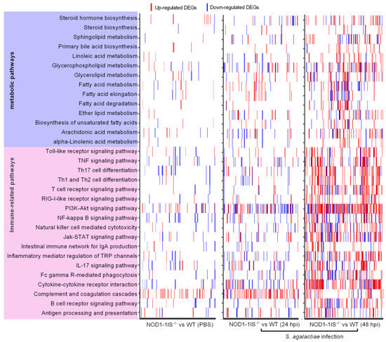 Heatmap presenting DEG profiles of each of the enriched immune-related and lipid metabolism pathways. The horizontal axis represents DEGs, and the vertical axis represents the enriched pathways. The existence of up-regulated DEG in a pathway is highlighted in red and down-regulated DEG is blue.