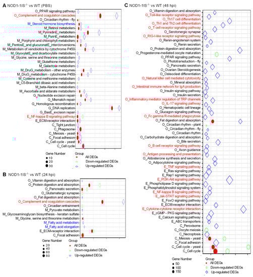 KEGG enrichment analysis. (A) The KEGG enrichment analysis for DEGs between WT and NOD1-deficiency zebrafish injected with the control PBS. (B) The KEGG enrichment analysis for DEGs between WT and NOD1-deficiency zebrafish infected with S. agalactiae for 24 h. (C) The KEGG enrichment analysis for DEGs between WT and NOD1-deficiency zebrafish infected with S. agalactiae for 48 h. All of the KEGG pathways shown in the figure are significantly enriched (Q-value < 0.05). The x-axis represents the rich factor, and the y-axis indicates the corresponding KEGG pathway. The immune-related pathways are red and the lipid-related pathways are blue. The color and shape of the point indicates the type of DEGs. The size of the point indicates the gene numbers.