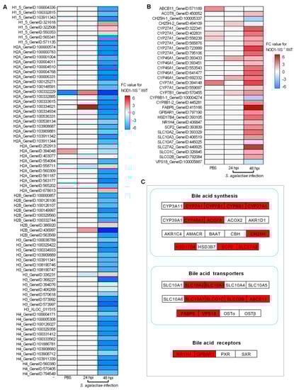 The effect of NOD1 deficiency on the transcriptional regulation of histones and many of the genes involved in bile acid metabolism. (A) Heatmap of differently expressed histones. (B) Heatmap of bile acid-related DEGs. (C) The expression trends of bile acid-related genes involved in bile acid synthesis, bile acid transporters, and bile acid receptors. The genes in red background were found to be differently expressed in the present study.