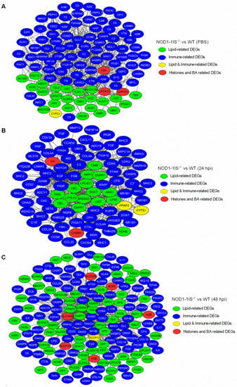 The results of the WGCNA correlation analysis showed that some lipid metabolism genes are closely related to immune-related genes (Figure 6). More complement genes including C2, C3, C5, C8A, C8B, and C9 were found in the NOD1-1IS−/− vs. WT group without infection (Figure 6A). Relatively few complement genes, including C3, C7, C8A, and C8G, were found in the NOD1-1IS−/− vs. WT group infected with S. agalactiae for 24 h (Figure 6B). However, only C6 was found in the NOD1-1IS−/− vs. WT group infected with S. agalactiae for 48 h (Figure 6C). Histone H2A and bile acid synthesis gene CYP7A1 play important roles in the NOD1-1IS−/− vs. WT group without infection, but not critical in NOD1-1IS−/− vs. WT group infected with S. agalactiae for 24 h (Figure 6A,B). More DEGs related to lipid metabolism, including SLC10A2, SLC27A2, SLCO2B, SCP2, and so on, were found in the NOD1-1IS−/− vs. WT group infected with S. agalactiae for 48 h. Bile acid transport associated protein SLC10A2 and histone H2B were critical in the NOD1-1IS−/− vs. WT group infected with S. agalactiae for 48 h (Figure 6C). The WGCNA-derived “hub proteins” for H2A, H2B, H3, and DEGs related to lipid metabolism are beneficial for us to capture data for identifying novel histone binding complexes and reconstructing metabolic networks.