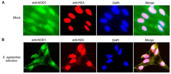 2.5. Histone H2A Is Translocated to the Cytoplasm and Colocalizes with NOD1 in the Case of S. agalactiae Infection